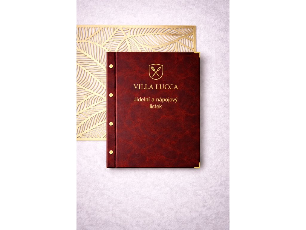 Desky na jídelní lístek A4 jsou potaženy červenou koženkou.