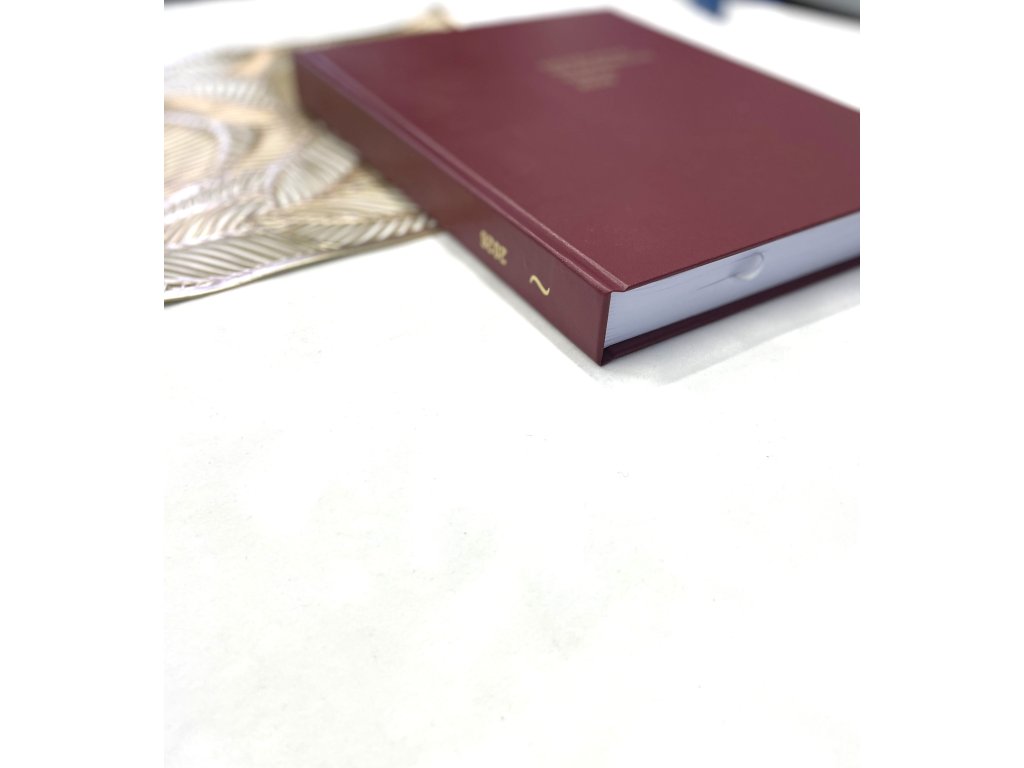 Ručně šitá kniha A4 s oboustranně tištěnými listy (1 den 1 list), rovný hřbet, celkem 384 stran.
