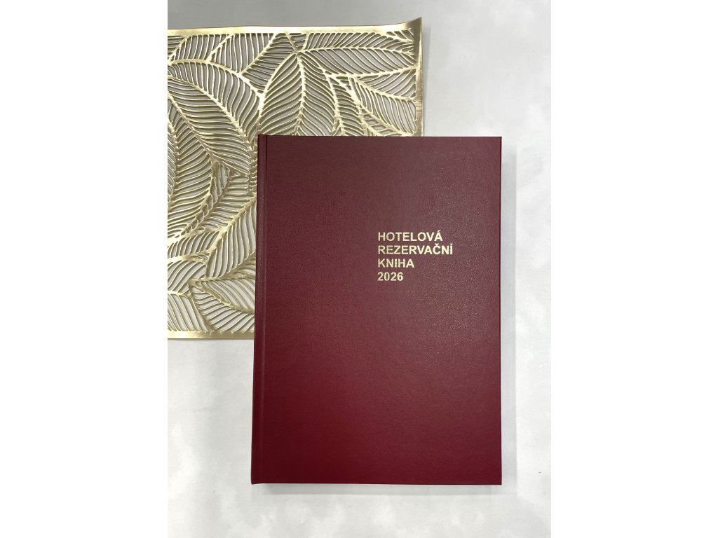 Na desce je zlatě nebo stříbrně vyraženo Hotelová rezervační kniha 2026.